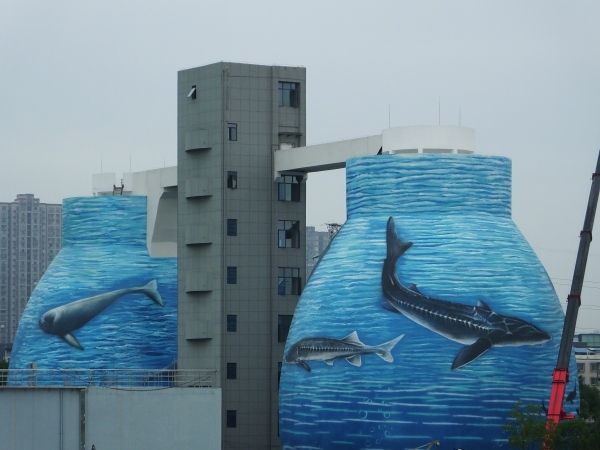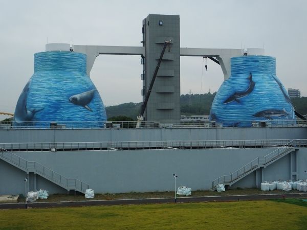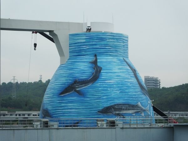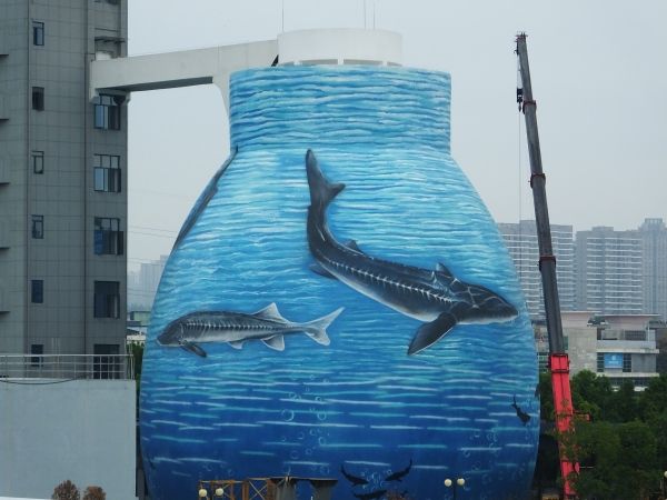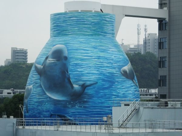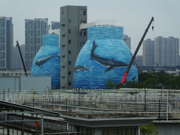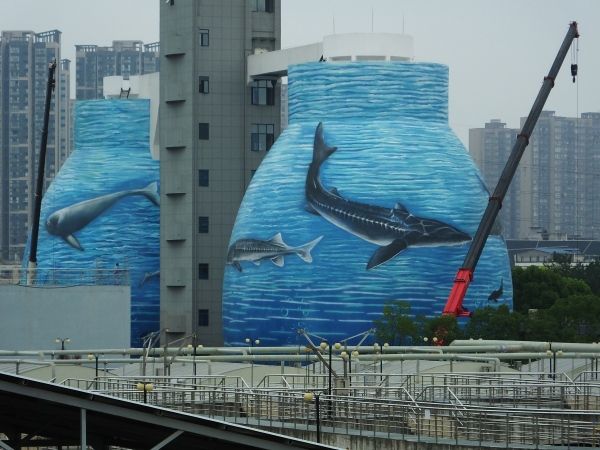 2022年9月25日,湖北宜昌的临江溪污水处理厂内,污泥处理罐上出现了彩绘的江豚、中华鲟图案。