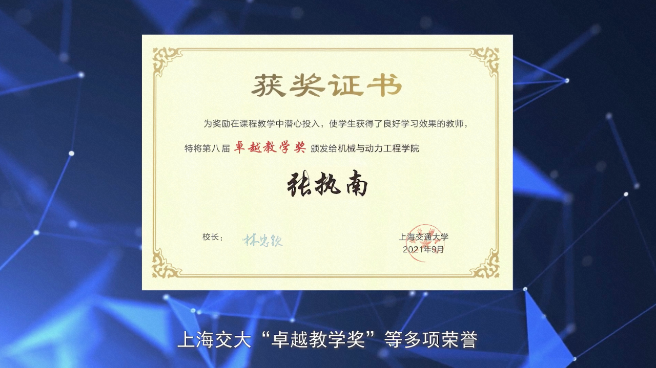 “扎根三尺讲台,潜心教书育人”,是张执南永恒不变的理念。他深耕教学多年,着力打造优质“金课”。任教以来,他先后主讲课程28门次,获得上海交通大学“卓越教学奖”、国家级教学成果奖二等奖、上海交通大学教学成果奖一等奖、教书育人奖(个人奖)三等奖等多项荣誉;负责的课程获评上海市重点课程、上海交大“双一流”研究生优质课程,获批上海交大第四批在线课程、混合式课程建设立项,入选致远荣誉课程,参编/译教材及参考书3部。
