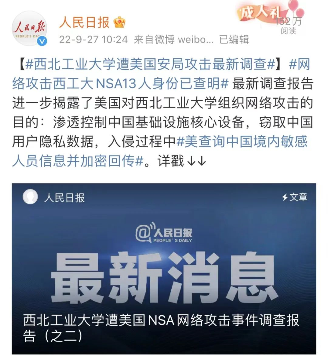 据人民日报消息,9月27日,《西北工业大学遭美国NSA网络攻击事件调查报告(之二)》发布,进一步揭露了美国对西北工业大学组织网络攻击的目的: