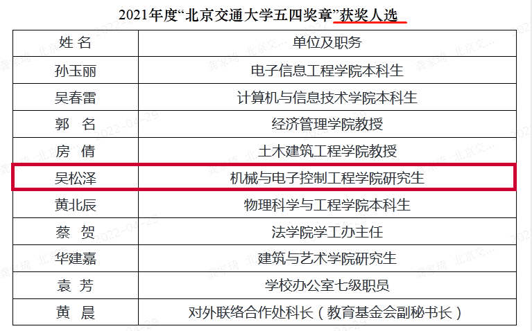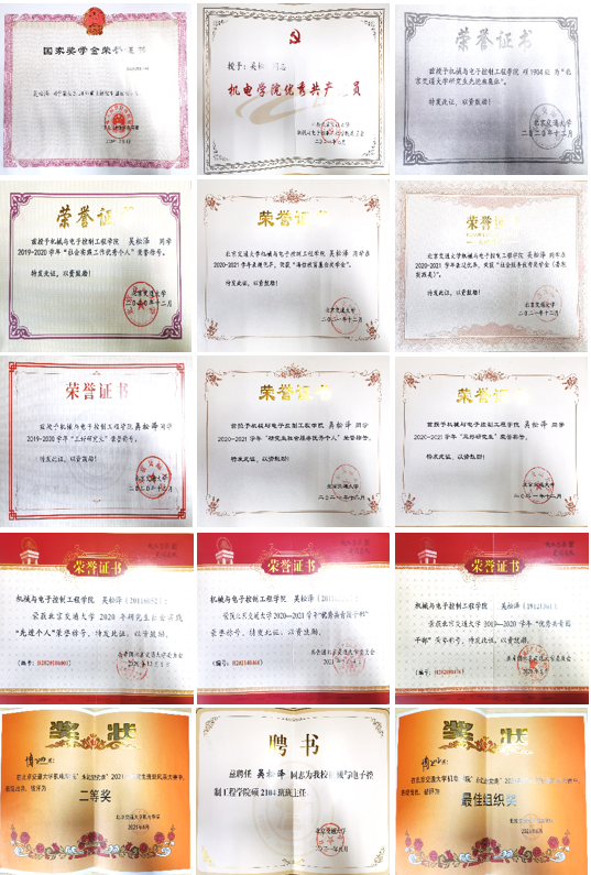 获评五四奖章的吴松泽,在校期间还获得了许多荣誉:2020和2021年分别获得硕士研究生国家奖学金和北京交通大学“海信奖学金”专项奖学金等。