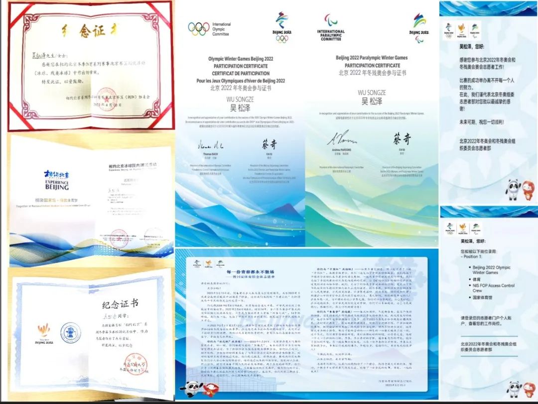吴松泽自研究生入学以来累计参与志愿服务800余小时。全程参与冬奥会、冬残奥会的筹备、彩排和志愿服务工作,作为一名“闭环”的专业志愿者,近距离为运动员提供保障服务,每日场馆志愿工作12小时有余,日均18000步。