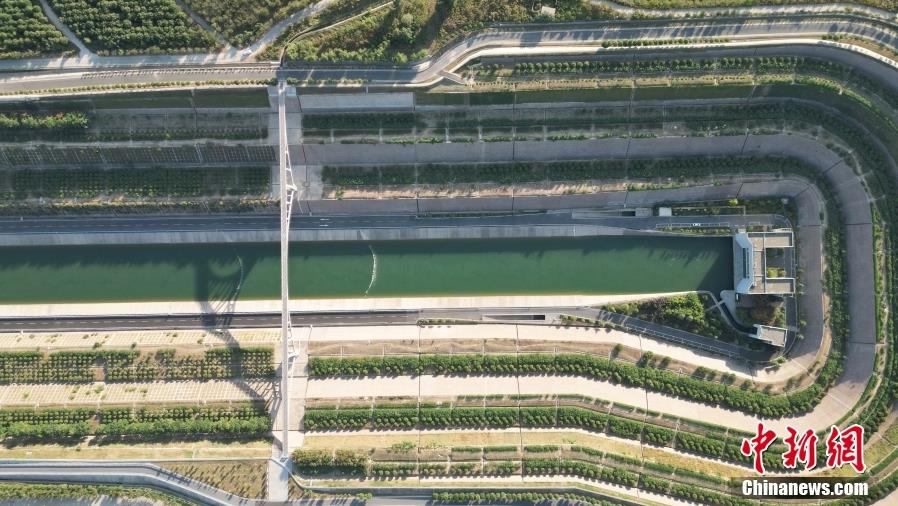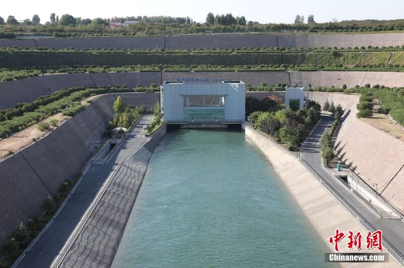 9月29日,河南郑州,南水北调中线干渠一泓清水穿黄河而过。南水北调中线穿黄工程是南水北调中线一期工程中的关键、控制性工程,是南水北调中线总干渠穿越黄河的大型输水工程,其任务是将中线调水从黄河南岸输送到黄河北岸。图为南水北调中线总干渠穿黄隧洞入口处。(无人机照片) 中新社记者 阚力 摄