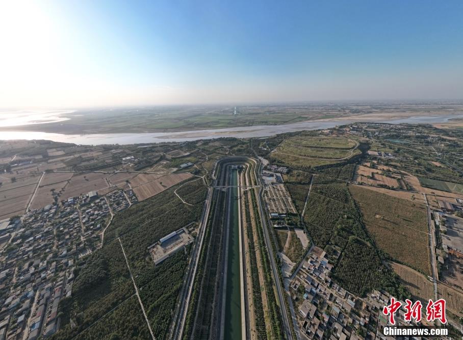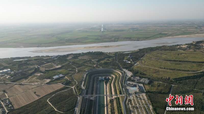 9月29日,河南郑州,南水北调中线干渠一泓清水穿黄河而过。南水北调中线穿黄工程是南水北调中线一期工程中的关键、控制性工程,是南水北调中线总干渠穿越黄河的大型输水工程,其任务是将中线调水从黄河南岸输送到黄河北岸。图为南水北调中线总干渠与黄河十字相交。(无人机照片) 中新社记者 李超庆 摄
