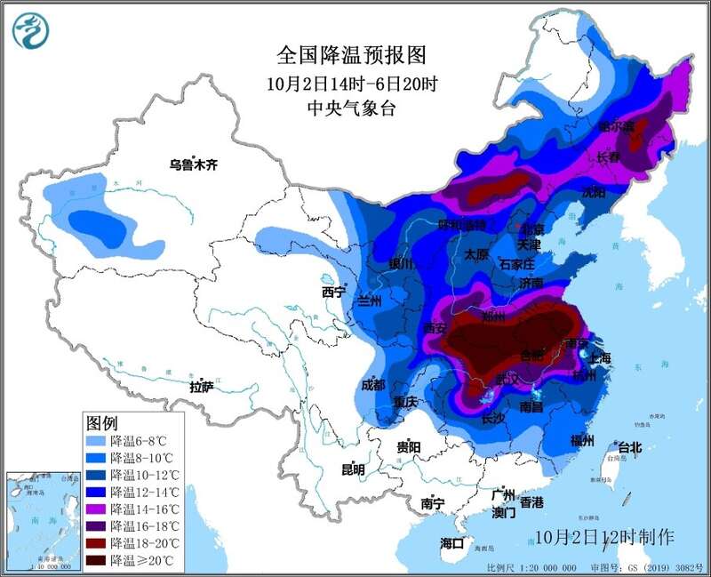 受强冷空气影响,10月2日14时至10月6日20时,中东部大部地区气温普遍下降8至12℃,内蒙古中东部、东北地区、陕西大部、山西南部、黄淮、江淮、湖南北部、江西北部、安徽南部、江苏南部、浙江北部等地降温12至16℃,其中,内蒙古中部、黑龙江东部、吉林东部、河南南部、湖北、安徽中北部等地部分地区降温幅度可达18℃以上。