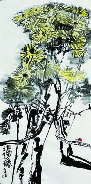 对菊花画法的总结,传统中最为全面的是《芥子园画谱》,集当时名画家沈心友、王概、王蓍、王臬之经验,但以现代眼光来看,他们总结的甚为精彩,但在表现上并没有达到当代花鸟画的表现的程度与境界。菊花作为草本花卉,有标准菊、盆栽菊、悬崖菊、金钱菊等,颜色有白、绿、黄、红、紫等,其形态有球形,有盘形,花头有平顶长瓣花、高顶攒瓣花,有含蕊、将放、初放、全放、残放等几个花期。花瓣有尖瓣、团瓣、折瓣、细瓣、卷瓣,形态有正面、侧面、背面、上仰、下俯等。画家画菊,无论工笔还是写意,都要在有力、有神、有笔、有墨中表现其神态。书法的中锋用笔,画面的透视关系,都是表现菊花精神意蕴的关键,寄性情于有无虚实之间,将不同时段、不同形态的菊花赋予一种生命蓬勃的意境之中。唐代张彦远论吴道子画:“意在笔先,画尽意在,虽笔不周而意周也。”明代高濂说:“士林中能作隶家画品,全在用神气生动为法,不求物趣,以得天趣为高。”清代恽寿平说:“今人用心在有笔墨处,古人用心在无笔墨处,倘能于笔墨不到处观古人用心,庶几拟议神明,进乎技已。”这些古人对于绘画笔墨的论述,依然是画菊包括一切花鸟画之准则与经验。古人认为,一个艺术家要具备才、胆、识、力,但对于事物的认识上,要具备理、事、情三方面的把握权衡,“合而为作者之文章”(叶燮《原诗》)。对于画菊之道来说,也有其独到的道理。