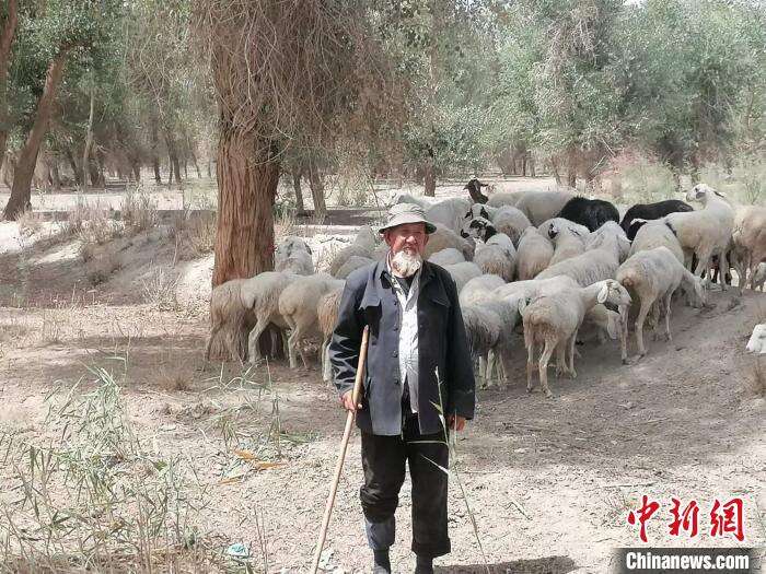 新疆80多岁老人依明·斯马依守护胡杨林逾40年见证林进沙退。图为退休后的他在胡杨林中放羊。 朱景朝 摄