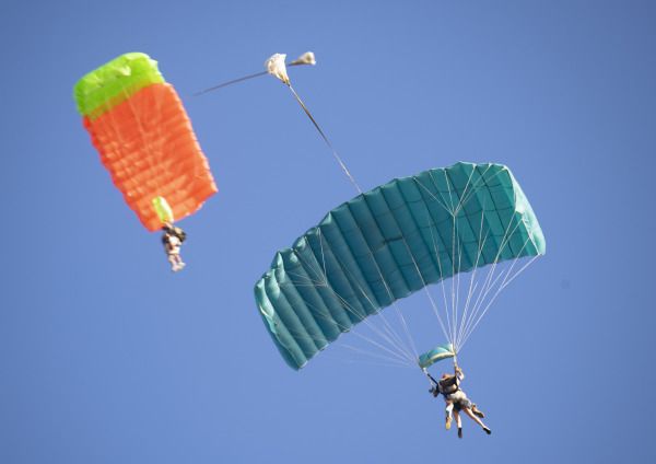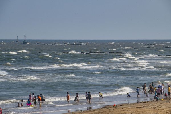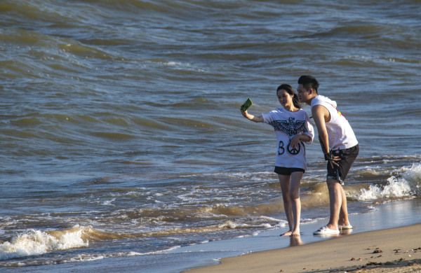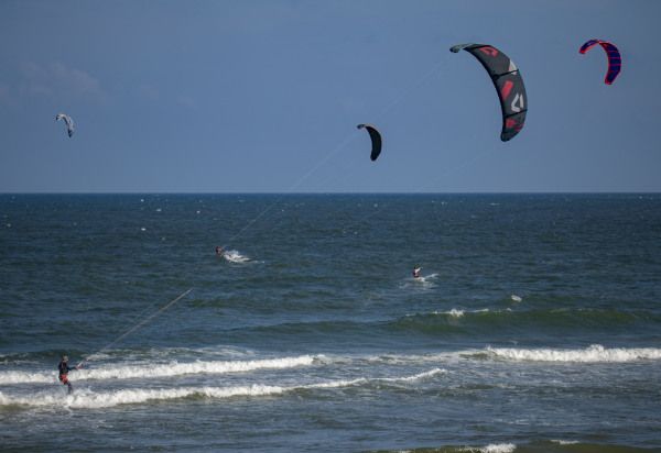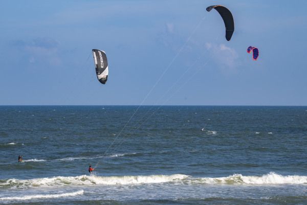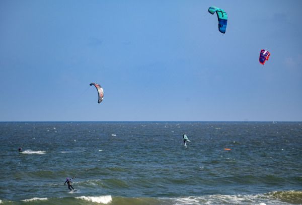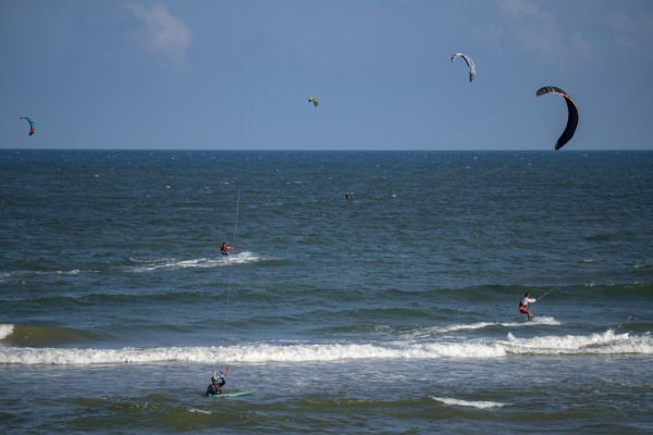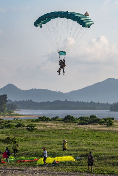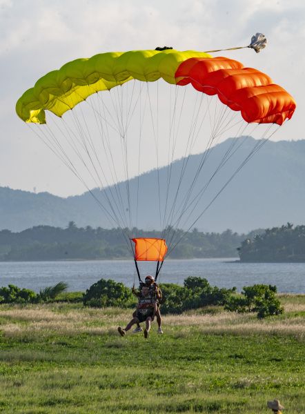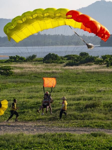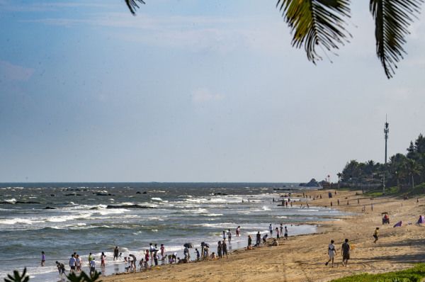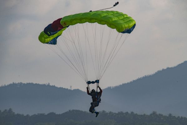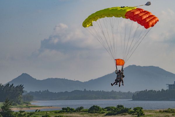 2022年10月5日,海南省琼海市,游人在博鳌体验高空跳伞。国庆假日黄金周第五天,海南风和日丽秋高气爽,众多游人在博鳌海滨或乘风筝板冲浪、或高空跳伞、或下海游泳戏水,过一个其乐融融的国庆假日。