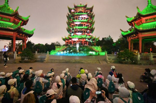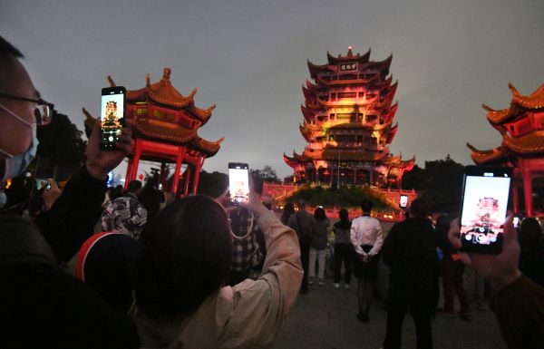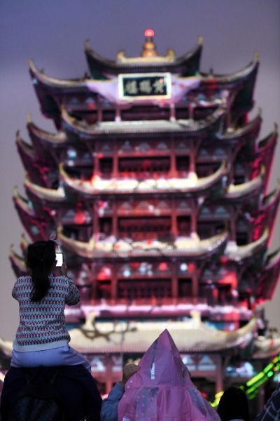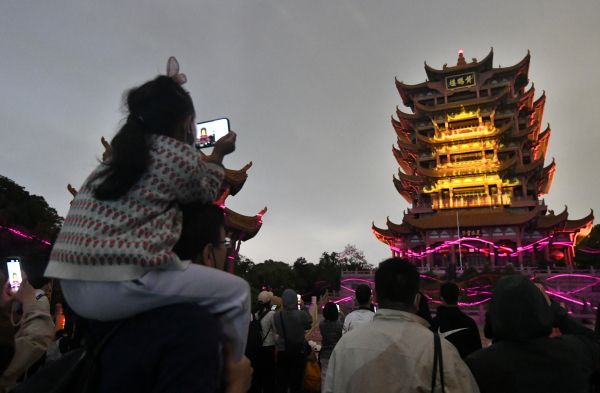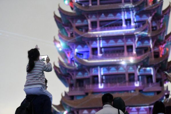 武汉:国庆假期 市民游客观赏黄鹤楼灯光秀