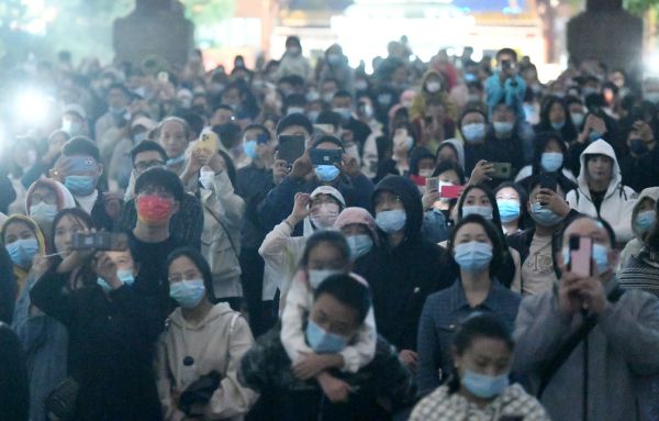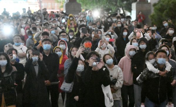 2022年10月4日晚,武汉,黄鹤楼被装点成传统与潮流交织的世界。不少来自全国各地的游客在此观赏灯光秀,夜游黄鹤楼。