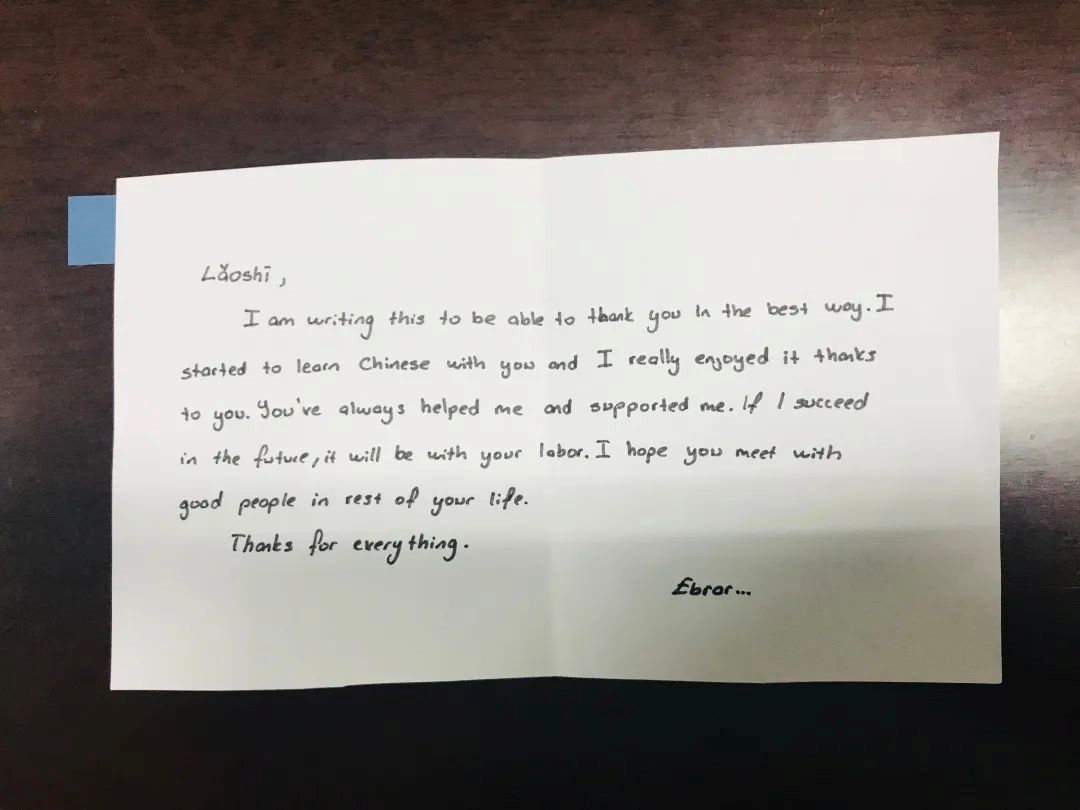 还有一位学员在送给邓军的卡片中写道:“我十分喜欢跟着老师您学中文,您总是帮助我、支持我。如果我未来取得了很大的成就,那一定有您的功劳。”