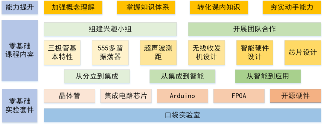 知识连续、零基础、信息可视,打造易学易用易入门的实验课程。以先修知识为基础,按照知识连续性与认知规律,循序渐进设计实验内容,激发学生学习兴趣,学生面对全新知识易入门。设计基础实验平台,开发了Arduino、单片机、FPGA、口袋实验室等零基础递进式实验模块,孵化科技兴趣小组,学生工程实践易上手。信息化实际场景,可视化抽象概念,生动形象展示实验内容,整合教学资源,独立课时教授基本仪器仪表测量方法,建设MOOC、短视频学习平台,有助于学生认知知识、加强理解。以学生课前易预习、课上易学习、课后易温习为目标,构建易学易用的递进式实验体系。