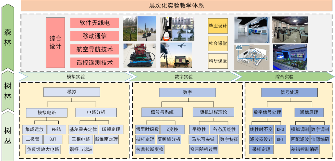 由点及面建立实验与课程的多维度交叉融合的知识体系,将课程理论知识与实验有机结合。通过课程实验重现经典形成“树丛”、综合实验贯穿课程构建“树林”、创新实验建立体系打造“森林”。建立了课程实验、综合实验、科研课堂、社会课堂与毕业设计相互连接的层次化实验教学体系。