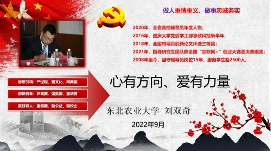 刘双奇,男,汉族,1982年1月生,中共党员,讲师,国家二级心理咨询师,现任东北农业大学食品学院副处级辅导员,2008年参加工作。曾先后荣获“黑龙江省高校辅导员年度人物”、全国高校辅导员工作优秀论文评选三等奖、东北农业大学“五四奖章”“优秀共产党员标兵”“优秀党务工作者”“就业先进个人”等荣誉称号。15年辅导员生涯中,刘双奇先后全程负责学院08、12级本科生和16、17、18、20级硕士研究生和全院博士研究生等2500余名学生的思想政治教育和管理服务工作。多年来,刘双奇始终将做好党的青年工作,教育、引领学生从成人走向成才作为辅导员不变的初心。刘双奇长期致力于大学生双创工作,先后与多家企业联合举办了食品创新大赛。还曾连续9年组织学生参加全国食品类创新竞赛,斩获5个全国一等奖和6个最佳组织奖;他首创的“食品安全进社区”“硕博沙龙”“六和英才班”“全过程实习”等教育形式,极大丰富了辅导员对学生教育引领的工作内涵。15 年间,他坚持工作在学生身边,注重因材施教与学生“五种能力”的培养,取得了显著成效,深受学生和家长好评。