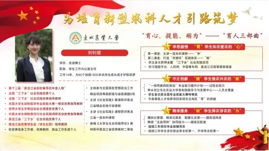 刘钊熠,女,汉族,中共党员,1985年3月出生,农学硕士,在读博士,讲师,国家二级心理咨询师,现任东北农业大学动物医学学院学生工作办公室主任、辅导员、校创新创业学院兼职教师、黑龙江省首批辅导员名师工作室劳动教育工作组负责人,主讲大学生职业生涯规划、创业基础、社会实践、劳动教育等课程。工作中,刘钊熠真正把本职工作当成全力以赴的主业、精益求精的专业、为之献身的事业,用十余载的青春年华努力践行“情系学生成长、做好良师益友”的高校辅导员誓言。通过构建“坚守主渠道、打通微循环”的思想政治教育工作格局,引导学生在学思践悟中坚定理想信念。创造性提出“三级阶梯式”知农爱农“一流”人才培养模型,实现梯次培养,守正创新,助推学业发展,为学生实现自我价值筑梦启航。以“专业、专心、专注”呵护学生、陪伴学生健康成长。