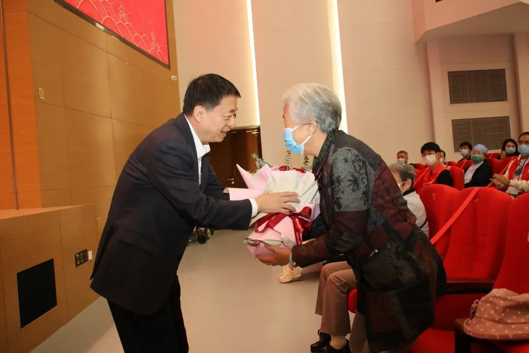 高浣月宣读了80岁、90岁整寿寿星名单,校领导向80、90岁的老同志表达了祝贺并为他们献上鲜花。