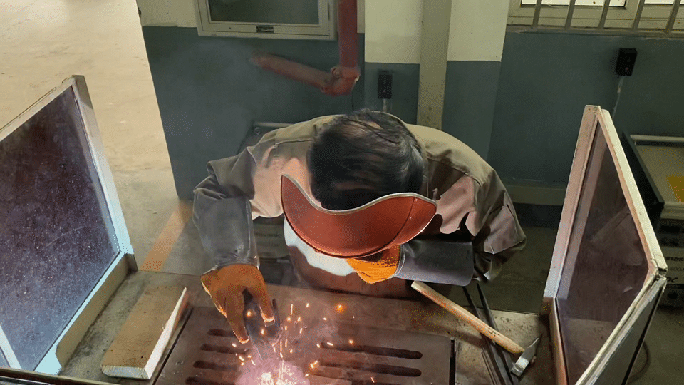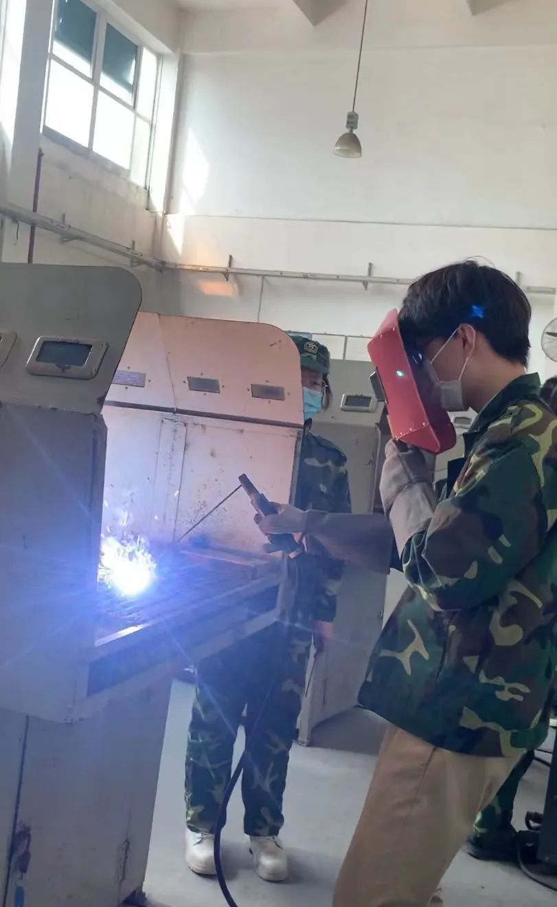 @林同学:以前远远看过汽修店进行焊接,那时候还很好奇地盯着电火花看,今天老师讲解时就一再强调,要用防护面罩,不要直接盯着,所有操作都要听从指挥,安全第一。分小组练习的时候,组员都会透过氖光玻璃小窗,给予操作者“手拿高一些”“慢慢来不着急”“太低了太低了”等提示。经过几次练习,在考核的时候终于能焊出一道还不错的焊缝啦!又成功学到一门技术, 开心!
