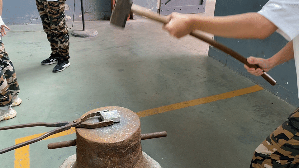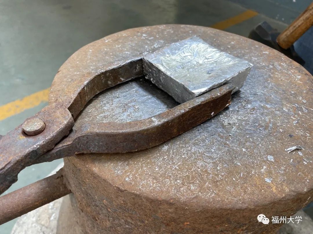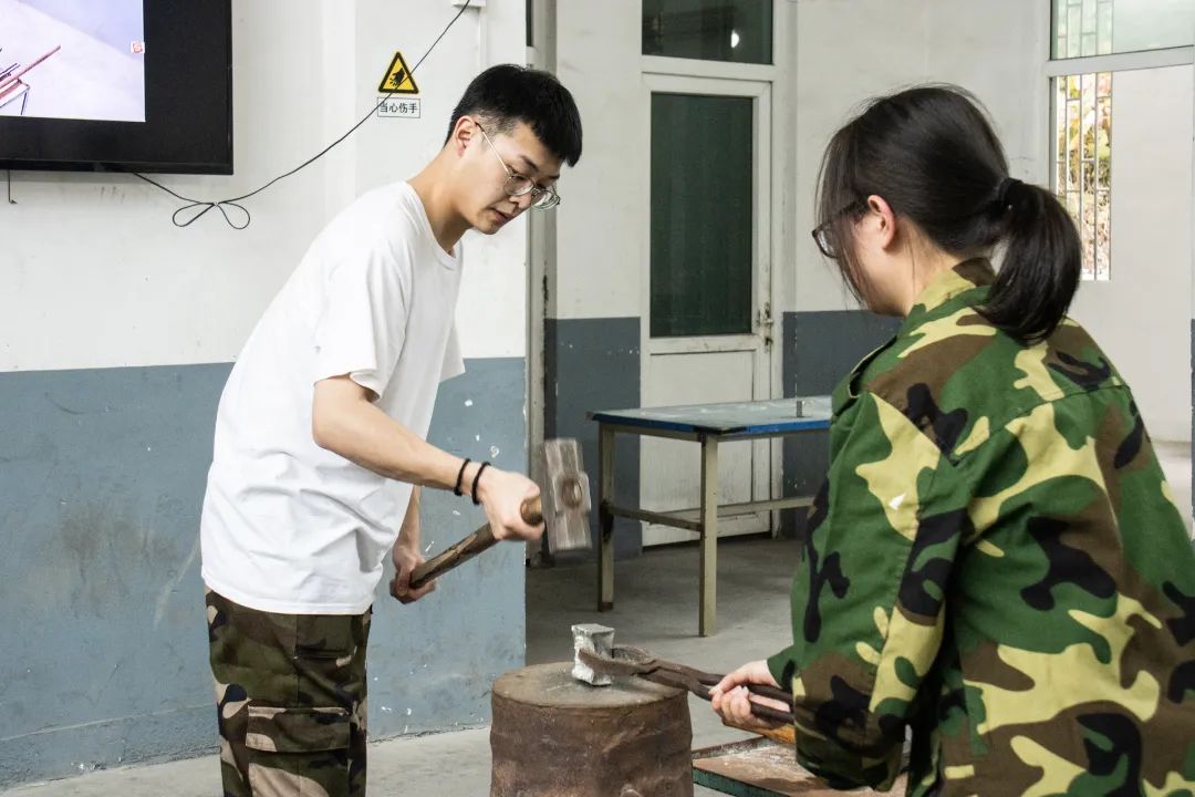 @林同学:我以为打铁是开玩笑的,没想到来真的!抡起大锤子打铁很累,我们小组采取轮流打铁的策略,一人用钳子固定铁块,一人用大锤子打铁,其余同学负责测量尺寸和指挥。打铁没有“大力出奇迹”,一个劲地砸只会得到一个瘪瘪不均匀的怪物体,是对臂力和智力的双重考验!