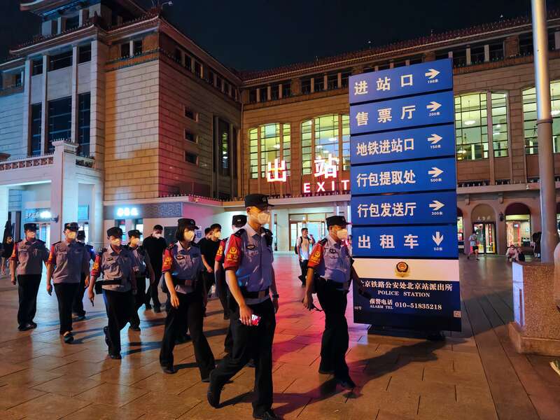 “十一”假期期间,民警在北京站夜巡。(图源:北京铁路警方)