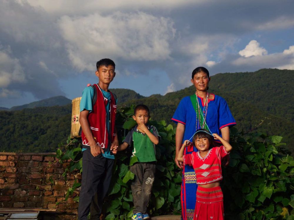 王发背着背篓跟妈妈去地里干活