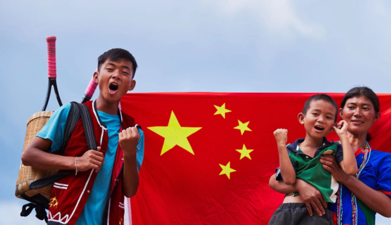 王发(左一)和弟弟、妈妈在国旗下的合影