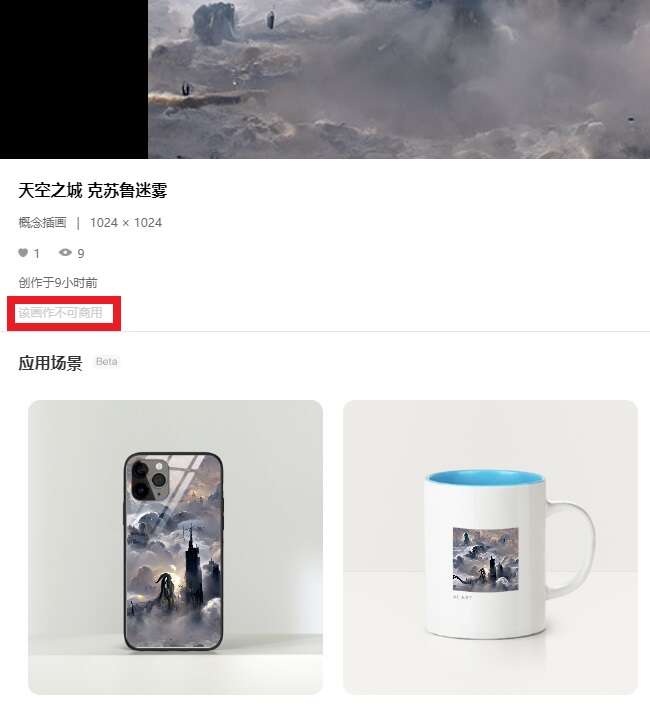百度文心·一格网页生成作品下方虽给出了周边产品开发示例,但也提醒“该画作不可商用”
