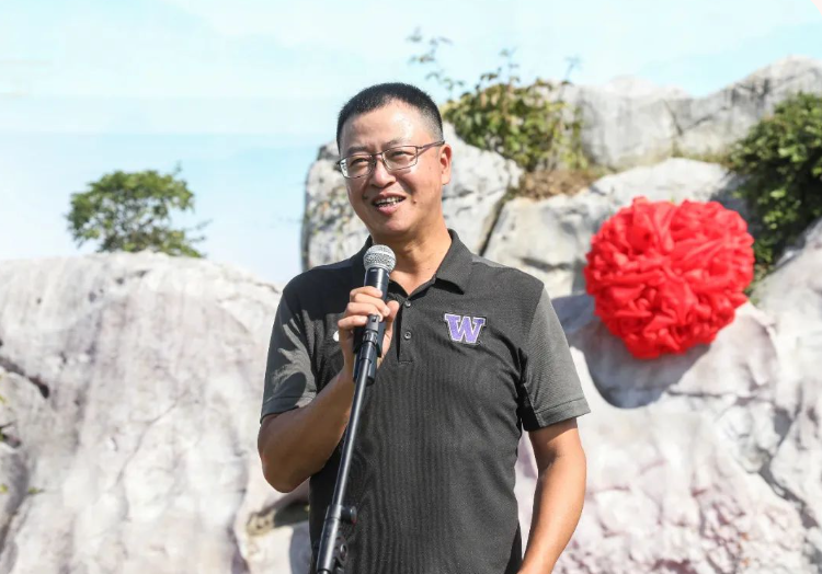 高分子88级校友代表贺明发言,他感谢母校的培养,表达了全体高分子88级校友对母校的情感如这方景观石般厚重绵长。