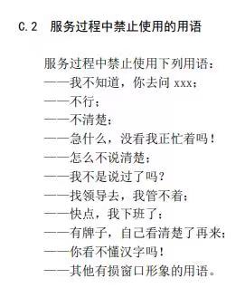 其中提到,服务过程中,应使用“先生、女士”等尊称和“请、您好、谢谢、对不起、再见”等敬语;禁止使用“我不知道,你去问xxx”“我不是说过了吗”“有牌子,自己看清楚了再来”等不文明用语。