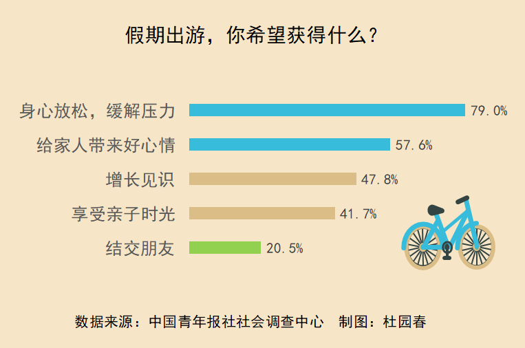 这个假期,人们的出行目的有哪些?79.0%的受访者表示是放松身心、缓解压力,57.6%的受访者是为了给家人带来好心情,47.8%的受访者希望增长见识,20.5%的受访者是为了结交朋友。