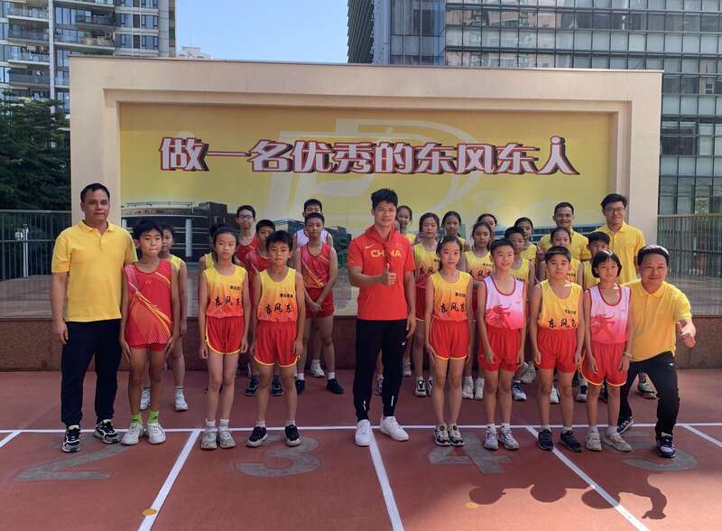 苏炳添与东风东路小学田径队队员合影。林洁/摄