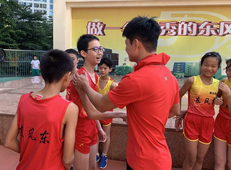 苏炳添鼓励东风东路小学田径队的小队员。林洁/摄