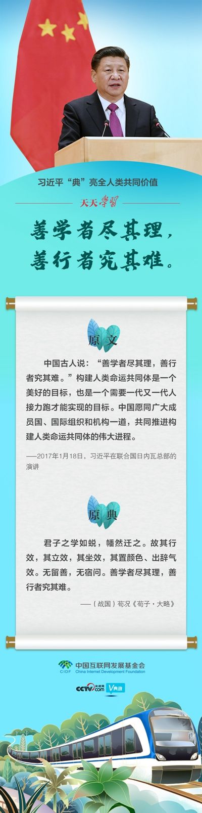 道阻且长,行则将至;行而不辍,则未来可期。构建人类命运共同体需要世界各国不懈努力。中国将同各国一道,逢山开路、遇河架桥,共创和平、安宁、繁荣、开放、美丽的世界,让人类命运共同体建设的阳光普照世界!