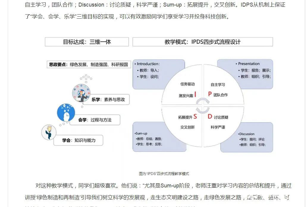 对这种教学模式,同学们超级喜欢。他们说:“尤其是Sum-up阶段,老师注重对学习内容的总结和提升,通过讲授‘绿色制造和再制造’引导我们树立科学的发展观,走生态文明建设之路,走绿色发展之路,走低碳、循环、可持续之路。老师还着重培养我们严谨、认真、求实的科学素养、创新精神。”