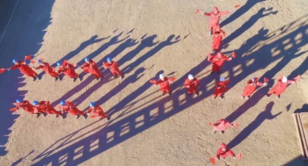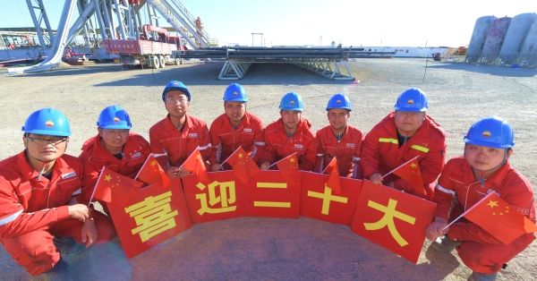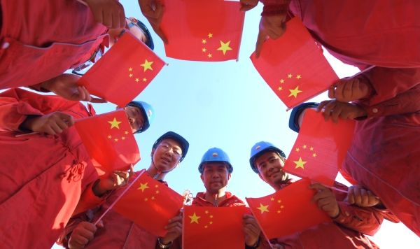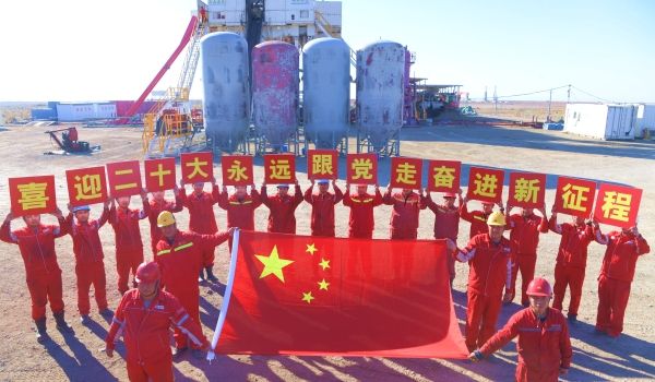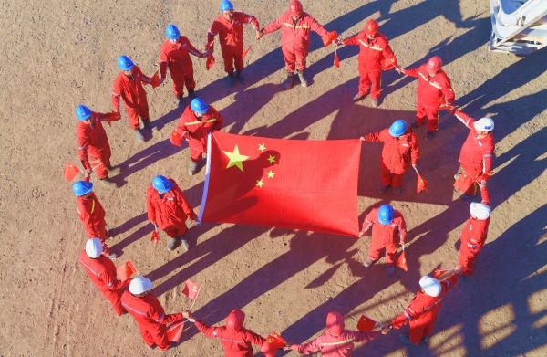 2022年10月13日,新疆克拉玛依,石油工人在金龙2油区钻井现场,摆拼各种造型喜迎党的二十大。中国石油西部钻探工程有限公司准东钻井公司70089钻井队干部员工,利用工作间隙,组织开展“我和国旗合张影”活动,以此祝福党的二十大10月16日在北京召开。