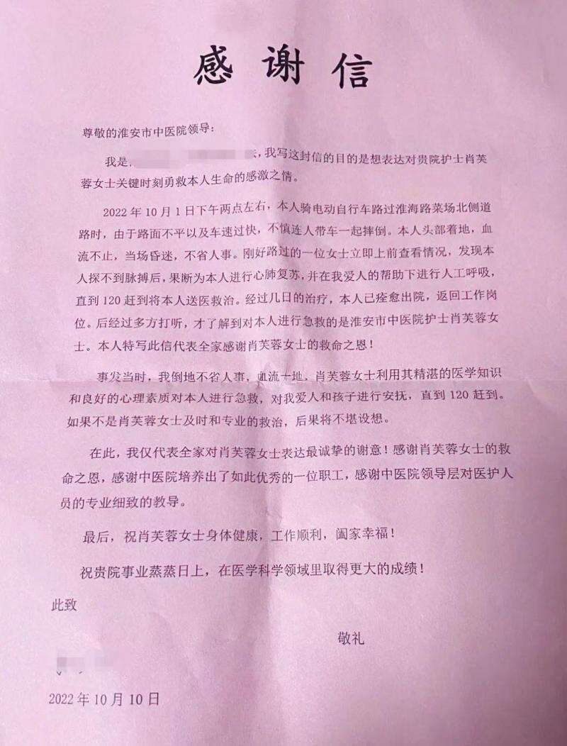 国庆节当天,江苏淮安一位市民骑电动车时不慎摔倒,头部出血、失去意识、心跳呼吸骤停。紧急时刻,一名女子冲上前,跪在患者身边抢救,直到协助120急救人员将患者送上救护车,才默默离开现场。10月14日,北京青年报记者从淮安市中医院了解到,救人的女子为淮安市中医院康复科护士肖芙蓉。肖芙蓉表示,救人是一种本能,换成任何一个医务人员都会这样做。