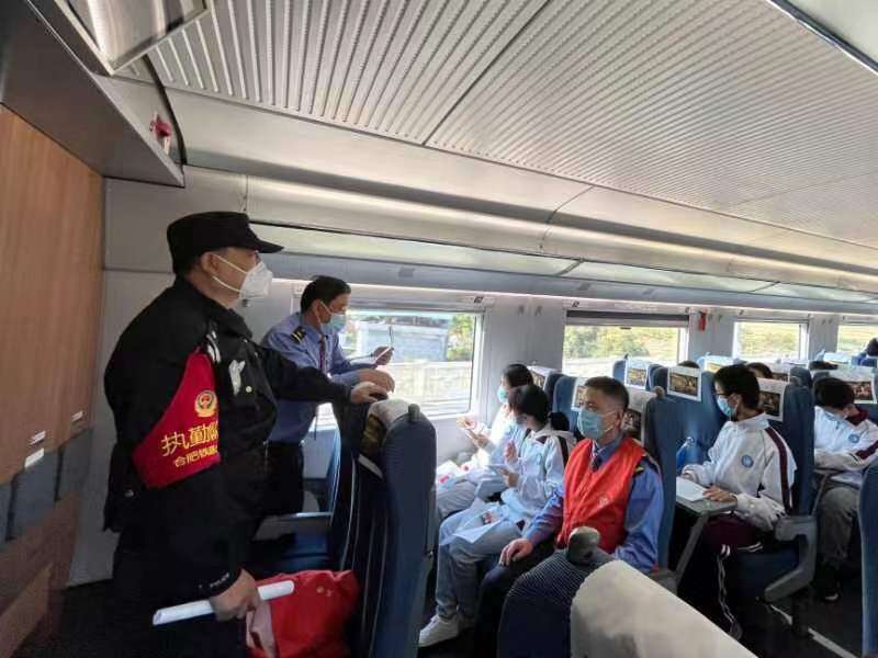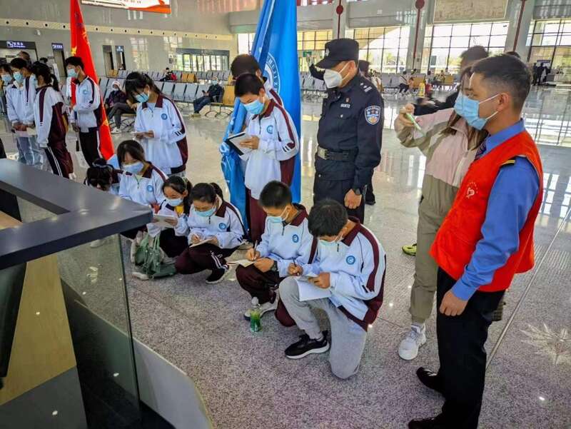 10月15日, 安徽省安庆市宿松县五里初级中学的老师、同学来到铁路宿松东站,开展“走近高铁,体验时尚”科学调查体验活动。现场,宿松东站青年志愿者、太湖站派出所民警讲解了铁路运营管理、高铁发展历程、高铁乘车安全事项、铁路外部环境安全等知识,同学们认真听讲、记录。在铁路志愿者及民警护送陪同下,老师和同学们一起乘坐高铁体验了中国速度。活动结束后,有同学表示,对中国高铁发展有了新认识,将努力学习,未来投身国家科技事业发展。
