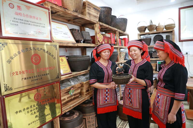 祝雪兰的祖辈父辈都是当地有名的制茶师傅。作为六堡茶制作工艺的第四代传承人,祝雪兰自小与茶香为伴,耳濡目染间传承父辈的传统制茶技艺。