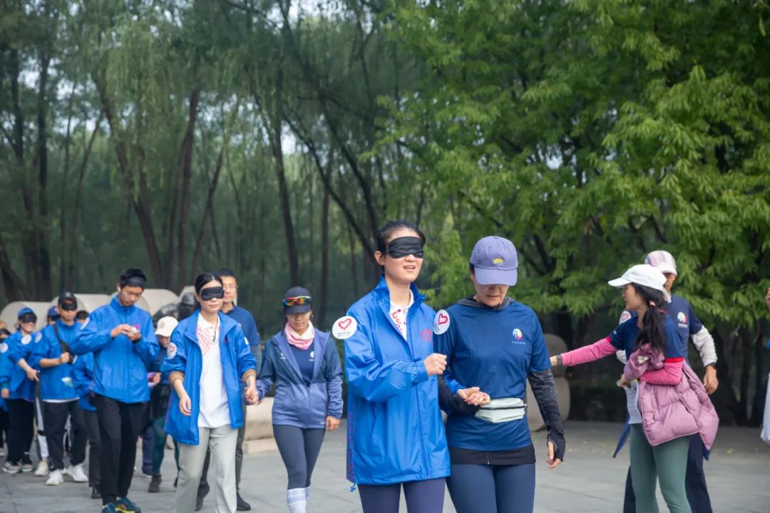 10月15日是国际盲人节。清晨6点20分,北京奥林匹克森林公园广场上,6支身着统一服装的团队陆续开始热身运动,他们衣服背后有的写着“视障”,有的写着“助盲”,在队长的带领下,各团队按照不同的配速,跑不同的长度。五队队长罗佳莉按照手里的结对名单,大声的喊着盲友和志愿者的名字,团队成员会应声分两队站好,每两人之间有一根翠绿的绳子连接。