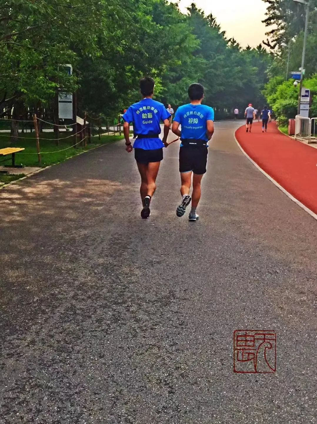这是北京何亚君助盲团的志愿者陪盲友跑步的例跑现场。团队每周三、周六例跑,经常参加的视障人士200多人,志愿者人数已达到3000余人。