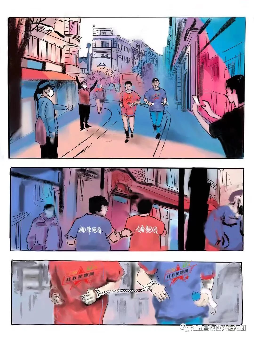 井冈山红五星残健共融跑团是江西吉安井冈山大学在校大学生和吉安市盲人协会于2022年5月成立组建的助盲跑团,参与活动的视障人士40人,助盲跑志愿者100余人。目前已开展十余次例跑,活动地点为吉州、青原、井冈山等。跑团开展了《有爱无碍—视障主题插画设计作品展》等主题活动,收到作品28幅,主要通过新媒体进行宣传。同时,项目还开展口述影像、文化助盲、名胜古迹伴游、井冈山精神宣讲、服务视障家庭等助盲志愿服务,举办了视障主题插画设计、助盲跑文创产品设计等活动,丰富视障朋友的精神世界,提高视障群体的社会关注度。