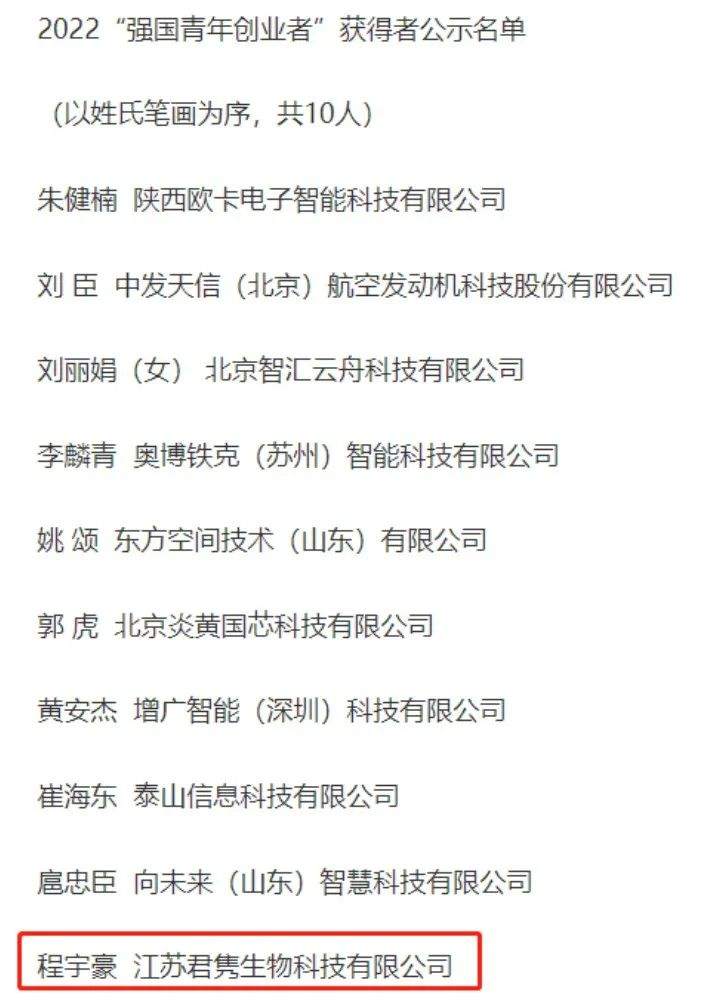 如今,江苏君隽生物已先后完成由紫金创投等机构领投的两轮数千万元融资,程宇豪也先后入选2021年福布斯中国30位30岁以下精英榜单及南京市第三届青年创业潜力新星、2022年江苏科技创新“U35攀峰”寻访及胡润百富U30中国创业领袖、南京市人社局创业导师、中国青年创新创业大赛国赛评委及南京市青联委员等。