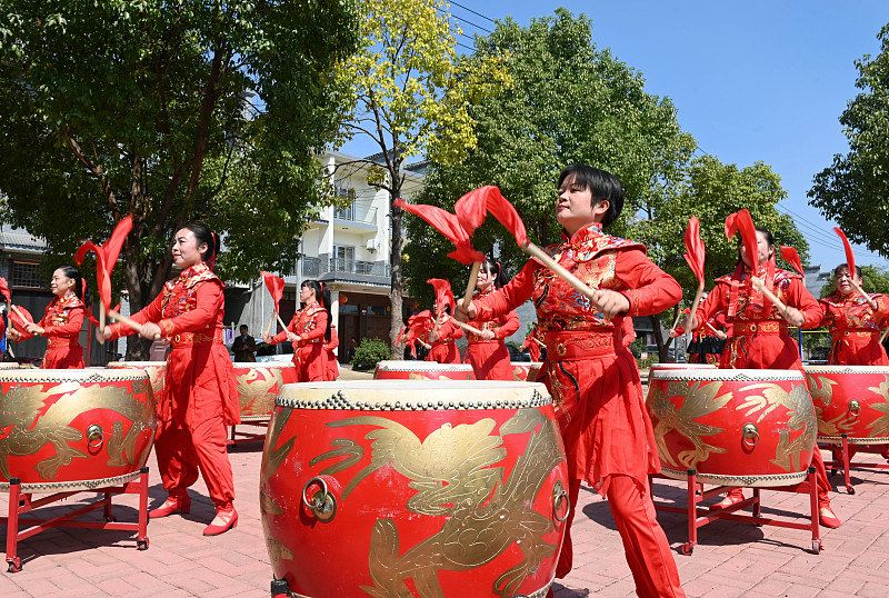 2022年10月14日,湖南省邵阳市,洞口县高沙镇高沙村文体广场上,文化志愿者打着昂扬的鼓点,载歌载舞,喜迎党的二十大,表达对党、对祖国的美好祝福。连日来,各地举行形式多样的欢庆活动喜迎党的二十大,讴歌党的丰功伟绩 ,处处洋溢着喜庆气氛。