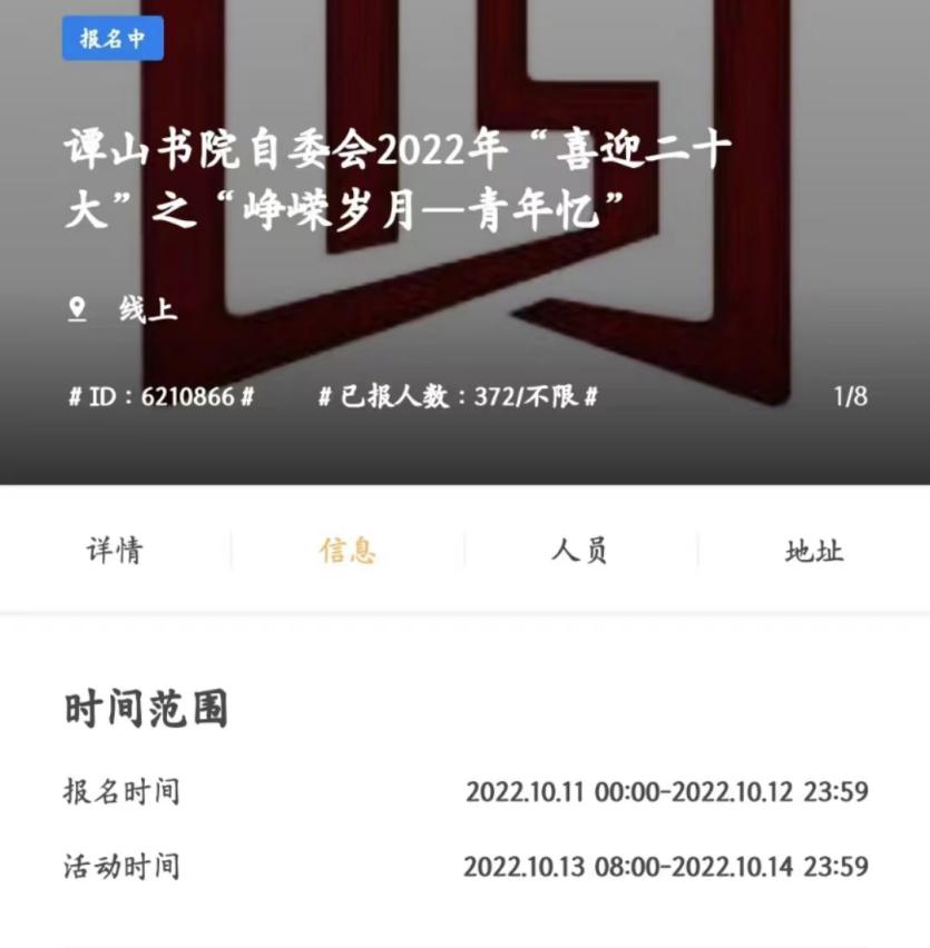 信阳师范学院第二课堂开展了一系列相关活动。信阳师范学院2020级的张明澈想要报名潭山书院“喜迎二十大”系列活动之“峥嵘岁月——青年忆”。这是一个视频混剪比赛,需要以影视作品中的重大历史事件或近十年来国家的发展建设为素材,最终形成作品。