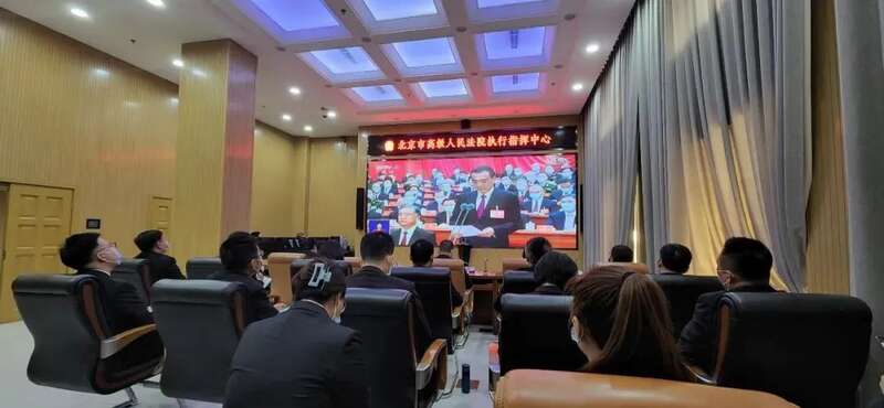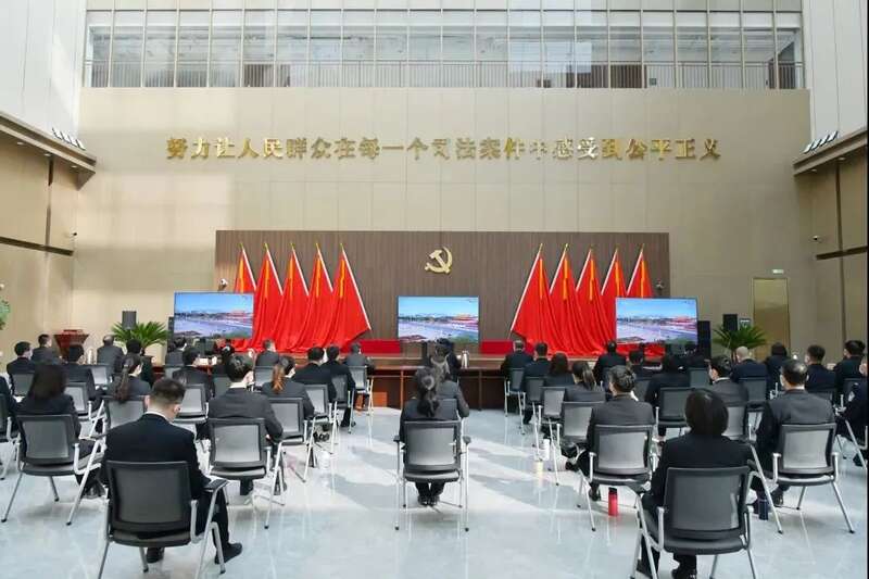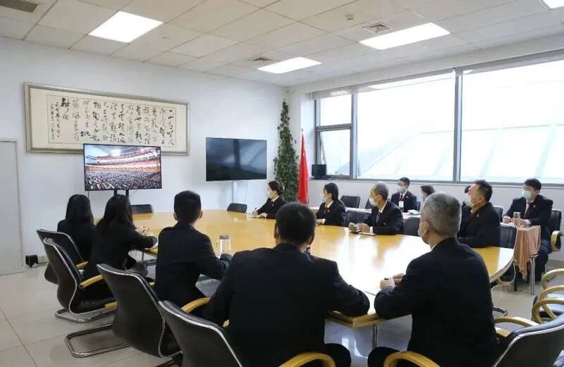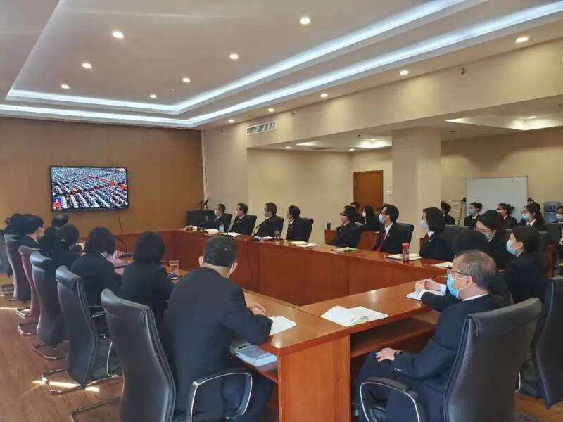北京高院机关党员干警分别在大法庭、各会议室收听收看开幕会现场直播,聆听习近平总书记重要讲话。