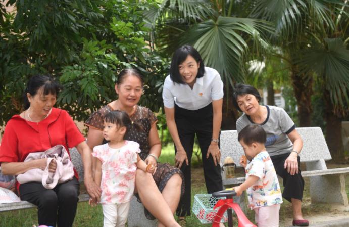 二十大代表、广东省佛山市禅城区古灶村党委书记、村委会主任陆秀兴(右三)和村民在一起聊天(2022年9月7日摄)。新华社记者 卢汉欣 摄