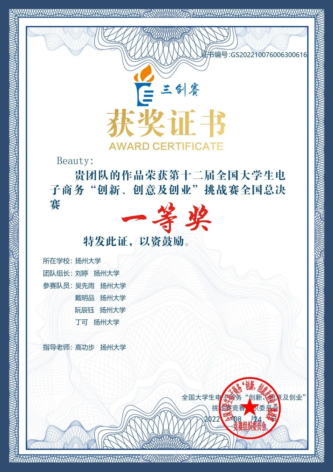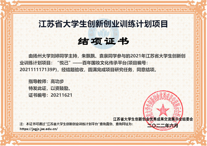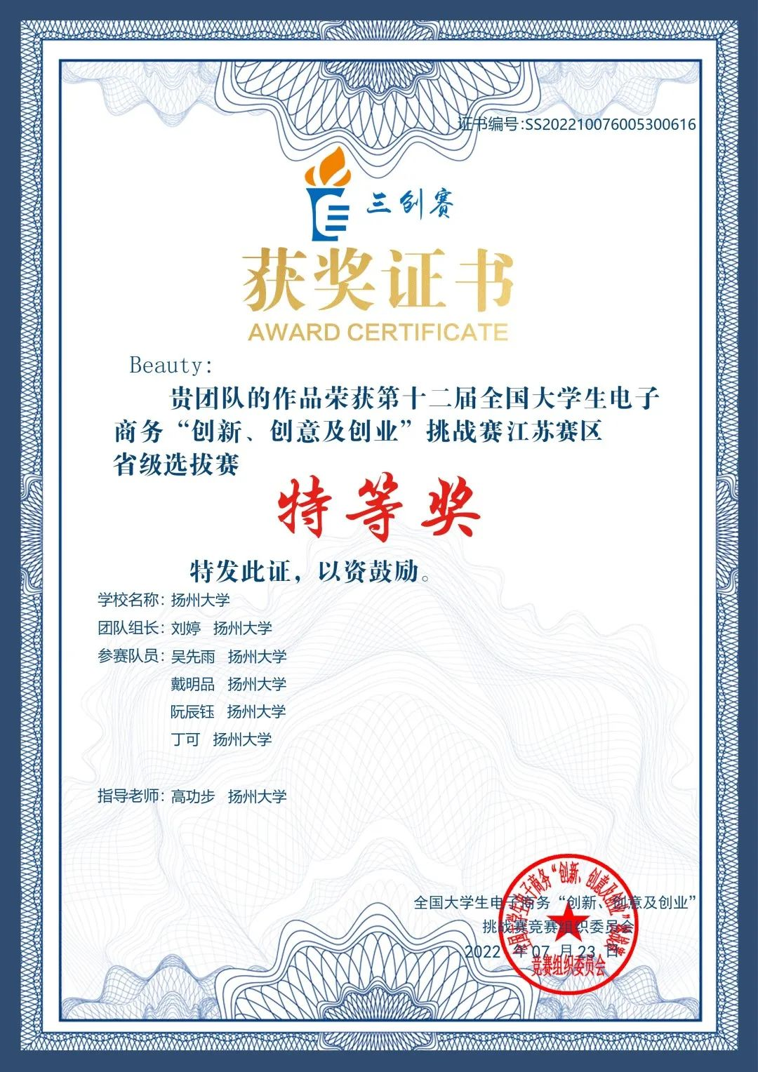 乐于钻研、勇于创新的刘婷积极参与大学生科创活动,主持江苏省大学生创新创业训练项目《“悦己”——百年国妆文化传承平台》1项,在省级期刊发表学术论文2篇。针对现阶段国妆老字号产品创新不足、传播渠道单一等痛点,创新性地构建了“1+2+N”模式,为国妆老字号提供一套集文化传承、产品创新于一体的解决方案,帮助国妆老字号重塑品牌活力。该项目先后获得了全国大学生电子商务“创新、创意及创业”挑战赛国家一等奖、江苏省特等奖、“挑战杯”竞赛江苏省银奖等多项殊荣,目前正在积极备战挑战杯国赛。
