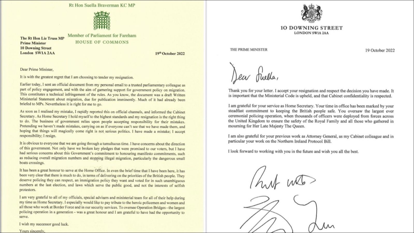 布拉弗曼的辞职信和特拉斯的答复。图片来源:《卫报》