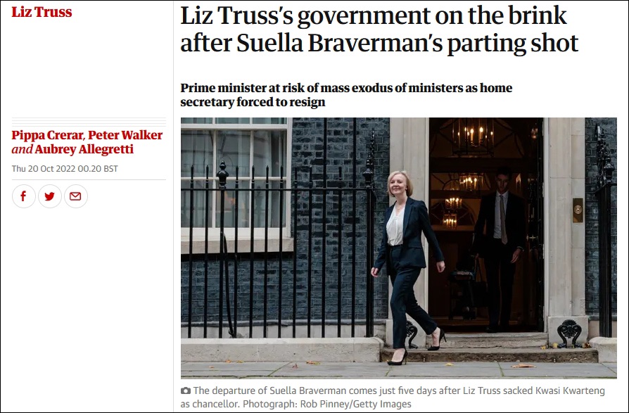 “特拉斯四面楚歌的政府似乎面临着崩溃的风险”,据英国《卫报》报道,当地时间周三(19日)下午,英国内政大臣臣苏拉·布雷弗曼(Suella Braverman)已经被迫辞职,并在一封用词严厉的辞职信中称对政府的方向“感到担忧”,她批评首相特拉斯违背了竞选时的“关键保证”。