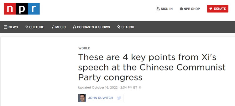 美国全国公共广播电台(NPR)和美国彭博社10月16日分别发文评析中共二十大报告,也都重点关注了报告中有关高质量发展的表述。彭博社的文章引述了新加坡国立大学东亚研究所所长贝尔特·霍夫曼的话,“习近平主席强调高质量发展是中国下一阶段的首要任务这点使我深感鼓舞。”而NPR的文章在最后得出这样的判断:中共二十大报告表明中国未来将坚持深化改革开放。