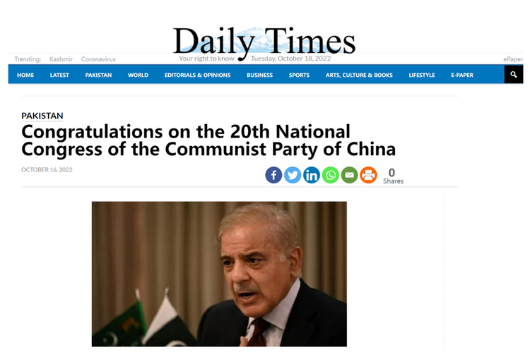 巴基斯坦《每日新闻报》16日报道称,巴基斯坦总理夏巴兹·谢里夫表示,巴基斯坦人民对中国共产党以人民为中心的执政模式、中国经济社会发展的成功以及中国对世界政治理念演进的重大贡献深表赞赏。中共二十大的成果将进一步提升巴中友谊。