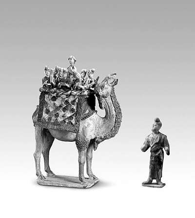 三彩载乐骆驼及牵驼俑(唐代),1959年西安中堡村唐墓出土。图片选自《国宝中的黄河文明》